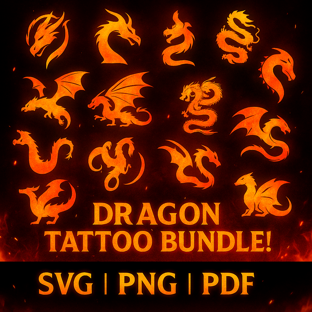 • What is included in the Dragon Tattoo Design SVG Bundle? The bundle includes versatile design files in SVG, PNG, and PDF formats featuring traditional, Japanese, Chinese, and modern dragon tattoo styles, suitable for various projects.
