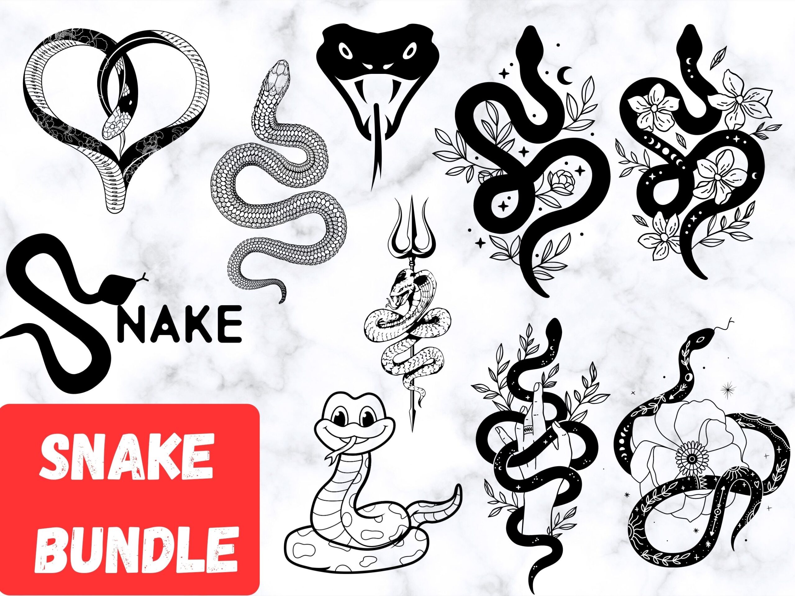 - Various snake styles: tribal, mandala, realistic, cartoon, and minimalist.